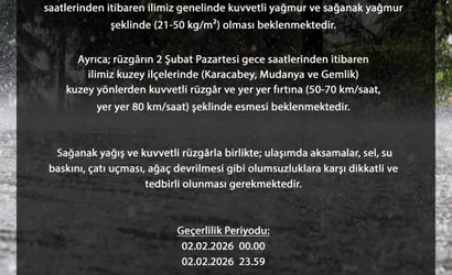Meteorolojik değerlendirmelere göre 2 Şubat Pazartesi öğle saatlerinden itibaren Bursa genelinde kuvvetli yağmur ve sağanak yağış bekleniyor. Yağış miktarının yer yer 21 ila 50 kilogram/metrekare arasında olması tahmin ediliyor.
