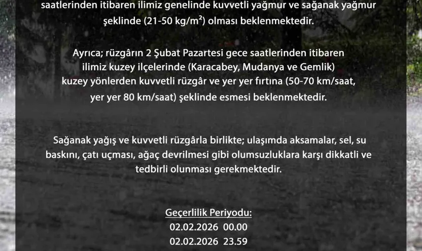 Bu geceden itibaren ilin kuzey ilçeleri olan Karacabey, Mudanya ve Gemlik çevrelerinde rüzgârın kuzey yönlerden kuvvetli, yer yer fırtına şeklinde esmesi öngörülüyor. Rüzgâr hızlarının 50-70 km/saat arasında, bazı noktalarda ise 80 km/saate kadar çıkabileceği bildirildi.