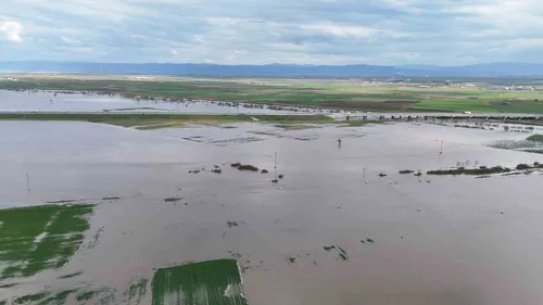 Bursa'nın Karacabey ilçesi Bayıraltı Mahallesi'nde üç gün süren yağışların ardından tarım arazileri suyla kaplandı; dron görüntüleri ve yetkili incelemeleri bölgeyi gösteriyor.