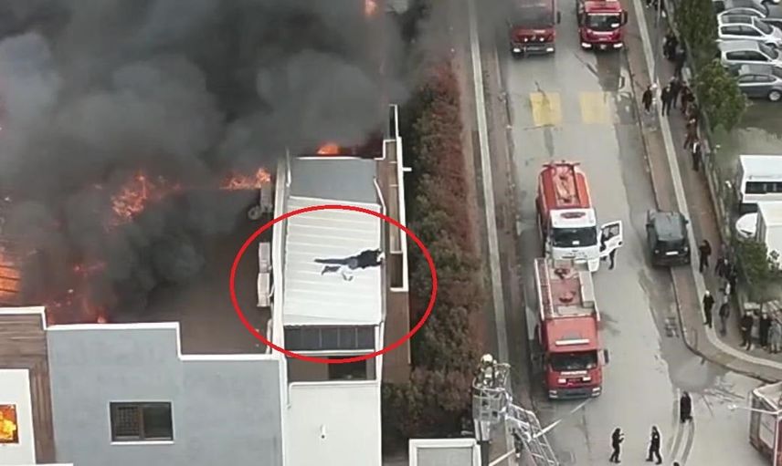 Olay, dron ile havadan görüntülendi; görüntülerde çatı katını saran alevler ve gökyüzünü kaplayan yoğun duman dikkat çekti.
