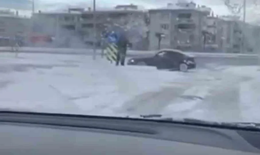 Kaygan zeminde tehlikeli manevra, çevredeki sürücüler ve yayalar için risk oluşturdu