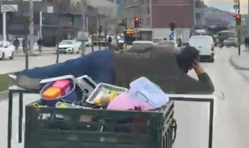 Olay, Osmangazi ilçesine bağlı Küçükbalıklı Mahallesi'nde meydana geldi. 16 BMN plakalı kasalı motosikletin kasa kısmına yerleştirilen masanın üzerine uzanarak yolculuk yapan bir adamın trafikteki rahat tavırları çevredeki sürücülerin ve cep telefonu kameralarının dikkatini çekti.