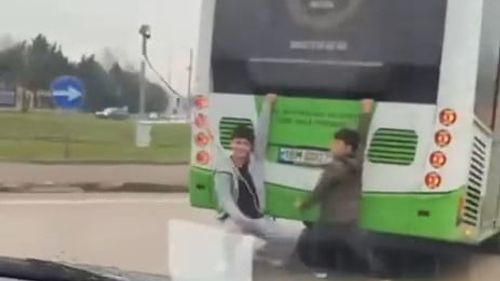 Bursa Yıldırım Millet Mahallesi'nde 10-15 yaşlarındaki iki çocuğun otobüs arkasına tutunarak ayaklarını yere sürdürdüğü tehlikeli yolculuğu cep telefonu kamerasına yansıdı.