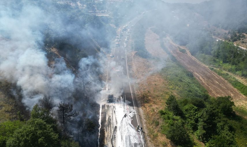 Bursa'nın Kestel ilçesinde motor yağı yüklü tırdan ormanlık alana sıçrayan yangın söndürüldü.