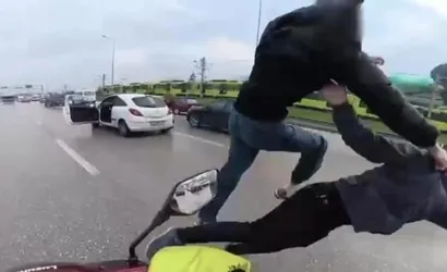 Bursa-İzmir yolu üzerinde iki sürücü arasında 'yol verme' meselesi nedeniyle çıkan tartışma, araçlarından iniş sonrası kavgaya dönüştü. Görüntülerde tarafların birbirine uçarak tekme attığı anlar yer aldı. O sırada yoldan geçen kurye ve çevredeki sürücüler müdahale ederek tarafları ayırdı.