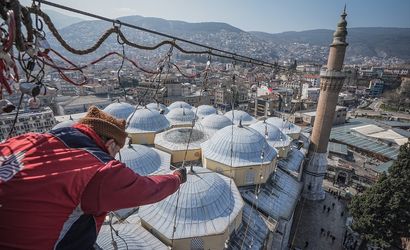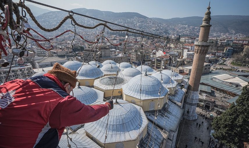 Bursa'daki tarihi Ulu Cami, Ramazan ayında anlam dolu bir etkinliğe ev sahipliği yapıyor. Caminin minareleri arasına, bu sene için belirlenen tema doğrultusunda 'Allah iyilik yapanları sever' yazılı mahya asıldı.