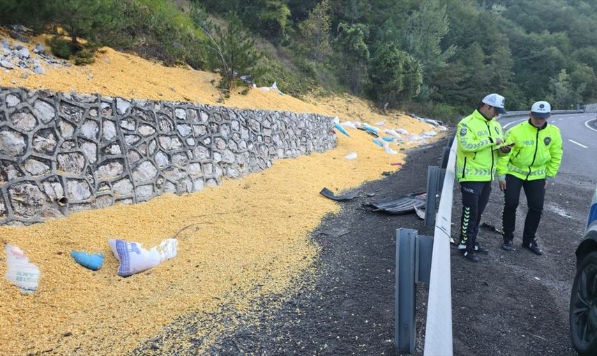 Kaza nedeniyle yolda biriken yem artıkları ekipler tarafından temizlenene kadar trafik akışında aksama meydana geldi.