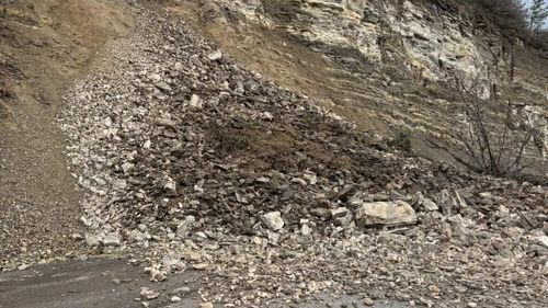 Bursa İnegöl Gülbahçe Mahallesi Bağlar mevkiinde meydana gelen heyelan, yamaçtan kopan toprak ve kaya parçalarının yolu kapatmasına yol açtı; anlar cep telefonu kamerasına yansıdı.