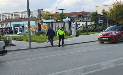 Bursa'nın İnegöl ilçesinde, trafik polisleri, koltuk değnekleriyle yolun karşısına geçmeye çalışan bir yaşlı kişiye yardım etti.