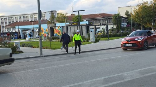 İnegöl'de trafik polisleri, Atatürk Bulvarı'nda koltuk değnekleriyle yolun karşısına geçmeye çalışan yaşlı kişiye yoğun trafikte durdurup yardımcı oldu.