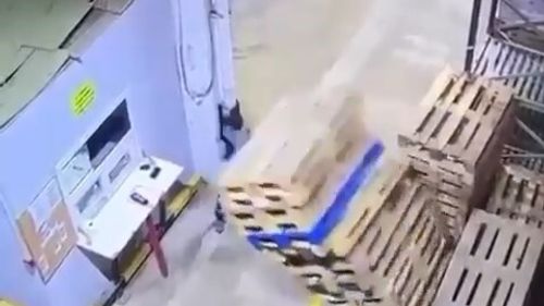 Bursa Organize Sanayi Bölgesi'ndeki fabrikada, forkliftle üst üste konulan dengesiz paletler devrildi; yanında bulunan kadın çalışan refleksle paletlerin altından kıl payı kurtuldu.
