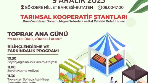 Bursa Büyükşehir Belediyesi, 9 Aralık’ta Gökdere Millet Bahçesi-BUTATEM'de 'Toprak Ana Günü' temalı Bursa Tarım Şenliği ile yerel tarım ve gıda ürünlerini tanıtacak.