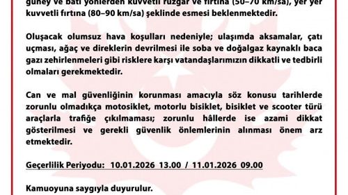 Bursa Valiliği, 10-11 Ocak 2026'de kentte 50-90 km/s hızla kuvvetli lodos ve fırtına beklendiğini belirterek vatandaşları tedbirli olmaya çağırdı.