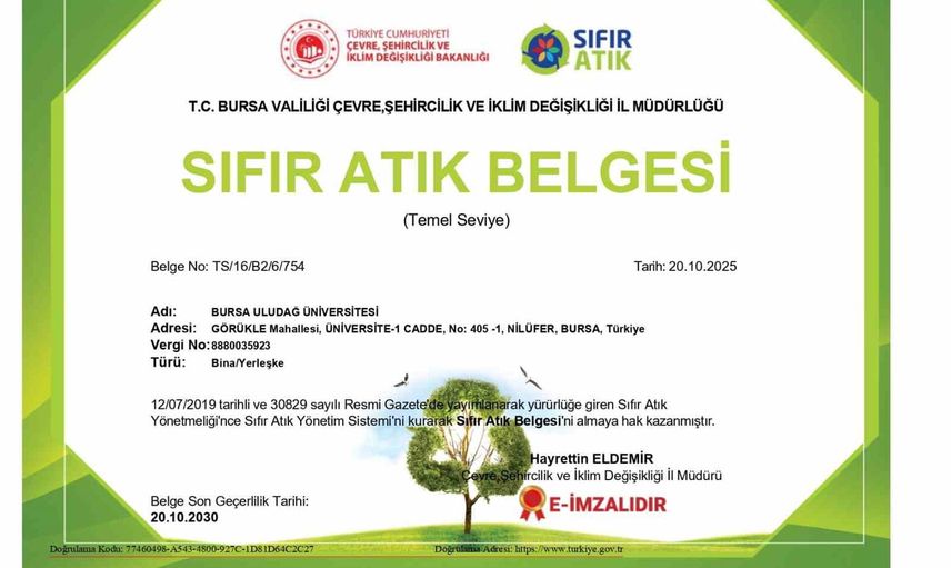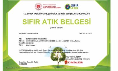 Bursa Uludağ Üniversitesi (BUÜ), sürdürülebilir kampüs hedefleri doğrultusunda yürüttüğü uygulamalarla "Sıfır Atık Belgesi"ni yeniletti. Yapılan resmi değerlendirme sonucunda belge, önceden 20 Ekim 2025 tarihinde sona erecek şekilde düzenlenmiş olan sertifikanın proje gerekliliklerinin başarıyla karşılanması üzerine 20 Ekim 2030 tarihine kadar uzatılmasına karar verildi.