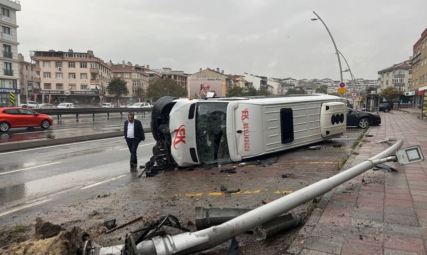 Minibüs, bir aydınlatma direğine çarparak devrildi ve ardından park halindeki bir otomobile çarptı.