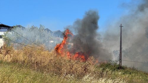 Büyükçekmece'de otluk alanda çıkan yangına itfaiye ekipleri müdahale ediyor. Yangın, rüzgarın etkisiyle hızla yayıldı.