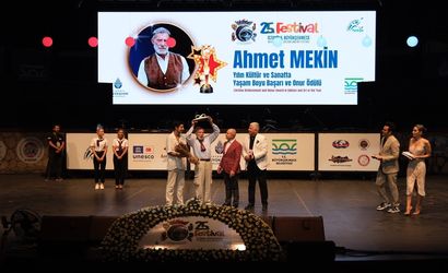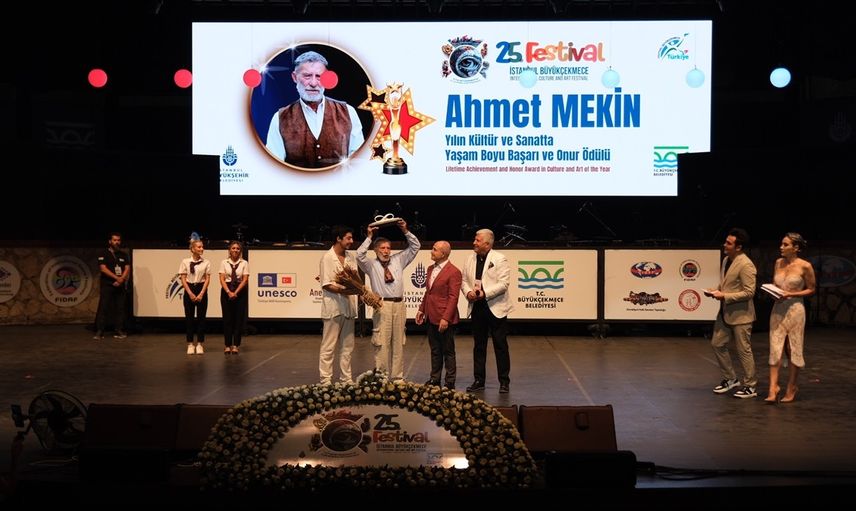 Büyükçekmece Belediyesi tarafından bu yıl 25'incisi düzenlenen "Uluslararası İstanbul Büyükçekmece Kültür ve Sanat Festivali" kapsamında Kültür Park Amfi Kemal Sunal Tiyatrosu'nda gerçekleştirilen törende "Kültür ve Sanatta Yaşam Boyu Onur Ödülü" Ahmet Mekin'e (sol 2) verildi.
