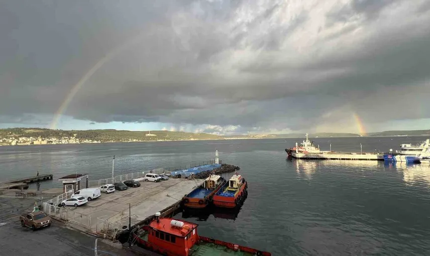 Çanakkale Boğazı'nda günün ilk ışıklarıyla ortaya çıkan çifte gökkuşağı, bölgede bulunanları ve manzarayı izleyenleri etkiledi.