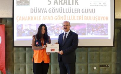 Çanakkale'de 5 Aralık Dünya Gönüllüler Günü etkinlikleri çerçevesinde, Deniz Polisevi'nde düzenlenen törende destek AFAD gönüllerine kimlik kartları teslim edildi.