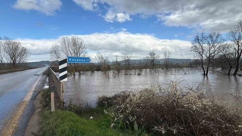 Çanakkale'de dün geceden bu yana süren sağanak sonrası Kocabaş Çayı taştı; Hurma ve Durali köy yolu ulaşıma kapandı, tarım arazileri sular altında kaldı.