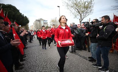 Çanakkale Valisi Ömer Toraman, Gelibolu Yarımadası'ndan alınan toprak, su ve Türk bayrağını öperek, atlet öğrenciler Nilhan Akaman ve Mehmet Serbes'e teslim etti.