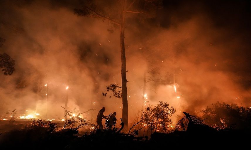 Kara ekipleri, rüzgarın etkisiyle ormanlık alanda ilerleyen alevlere müdahale ederken, iş makineleri ve dozerlerle yangının ilerlemesinin önüne geçilmeye çalışılıyor.