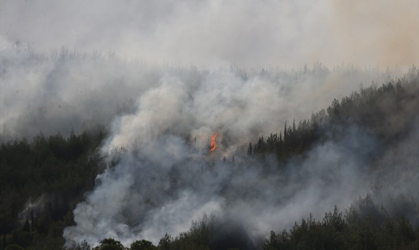 12 uçak, 18 helikopter, 155 arazöz, 8 iş makinesi, 899 personelle müdahale ediliyor. AA ekibi, yangının boyutunu ve etkili olduğu alanı dronla görüntüledi.