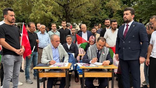 Çankırı'da AK Parti İl Gençlik Kolları, Karatekin Parkı'na yerleştirilen boş okul sıralarıyla Gazze'de hayatını kaybeden çocukları andı; yetkililer anı defterine duygu ve düşüncelerini yazdı.