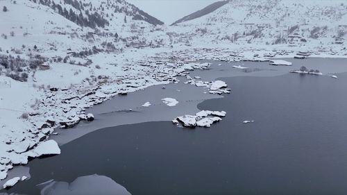 Adıyaman'daki Çat Barajı'ndaki yüzen adalar, soğuk hava etkisiyle donarak etkileyici manzaralar oluşturdu.