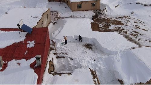 Van'ın Çatak ilçesinde yoğun kar sonrası vatandaşlar, ahır çökme riskini önlemek için damlardaki birikintileri küreklerle temizlemeye başladı.