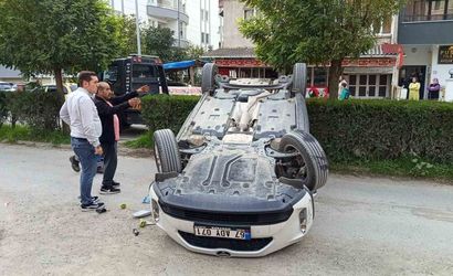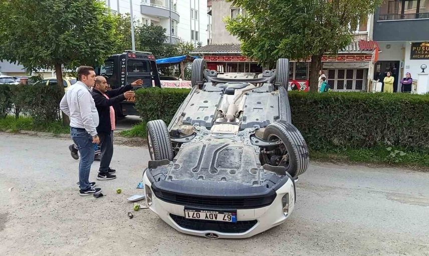 Çaycuma'da park halindeki araca çarpan otomobil ters döndü