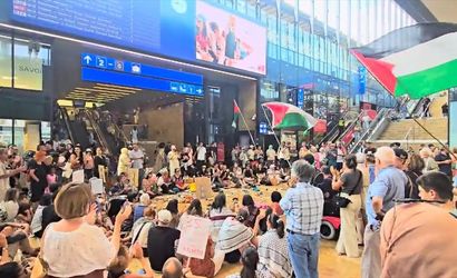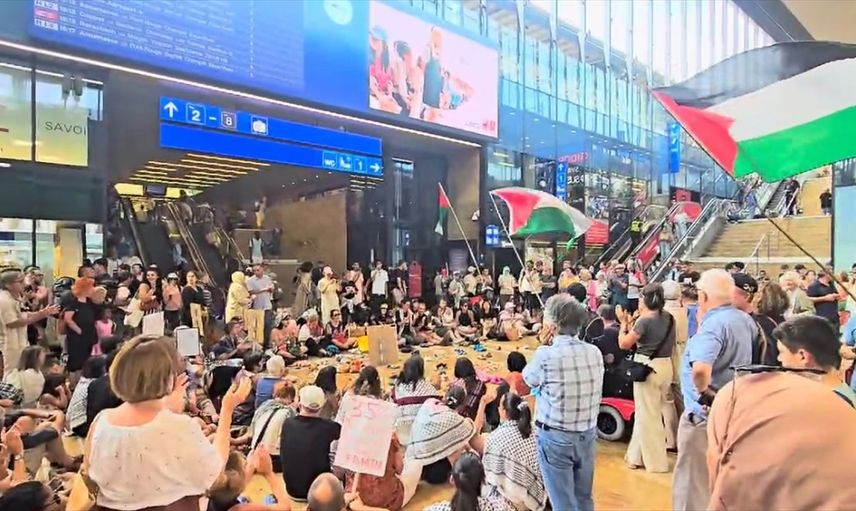 Cenevre'nin merkezindeki Cornavin Tren Garı'nda bir araya gelen 100'ü aşkın kişi, Filistin'e destek için seslerini yükseltti. Protestocular, oturma eylemi yaparak dikkat çekti.