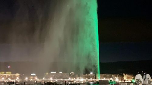 Cenevre'nin simgesi Jet d'Eau, 30 Mart Uluslararası Sıfır Atık Günü'nde yeşil renkle ışıklandırıldı.