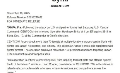 ABD Savunma Bakanı Pete Hegseth ise operasyona ilişkin, bunun 13 Aralık'ta Tedmur bölgesinde ABD güçlerine yönelik gerçekleştirilen saldırıya doğrudan yanıt olduğunu yineleyerek, 'Operasyon, DEAŞ savaşçılarını, altyapısını ve silah mevzilerini ortadan kaldırmayı amaçlamaktadır' ifadesini kullandı.