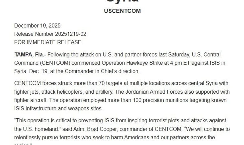 ABD Merkez Kuvvetler Komutanlığı (CENTCOM), Suriye'deki DEAŞ unsurlarına yönelik başlatılan Hawkeye Operasyonu kapsamında 70'ten fazla hedefin vurulduğunu açıkladı. Yapılan paylaşımda, operasyonun Suriye'nin Tedmur (Palmira) bölgesinde düzenlenen saldırıya misilleme amacıyla Başkan Donald Trump talimatıyla başlatıldığı hatırlatıldı.
