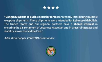 ABD Merkez Kuvvetleri Komutanlığı (CENTCOM) Komutanı Amiral Brad Cooper, Suriye güvenlik güçlerini son dönemde birden fazla silah sevkiyatını engelledikleri için tebrik ettiğini duyurdu.