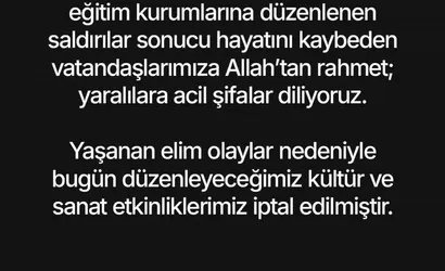Başkan Çerçioğlu, sosyal medya üzerinden yaptığı açıklamada şu ifadelere yer verdi: "Şanlıurfa ve Kahramanmaraş’ta eğitim kurumlarına düzenlenen saldırılar sonucu hayatını kaybeden vatandaşlarımıza Allah’tan rahmet; yaralılara acil şifalar diliyoruz. Yaşanan elim olaylar nedeniyle bugün düzenleyeceğimiz kültür ve sanat etkinliklerimiz iptal edilmiştir. Başımız sağ olsun".