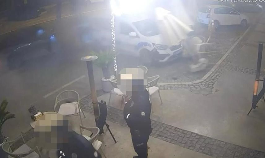 Kaza, 00.15 sıralarında meydana geldi. İddiaya göre sürücüsünün kimliği ve plakası henüz belirlenemeyen otomobil, park halindeki polis aracına çarptı. Çarpmanın şiddetiyle her iki araç farklı yönlere savruldu; ekip aracının kafeteryanın dış bölümüne girmesi sonucu şemsiyeler, masa ve sandalyeler etrafa savruldu. Olay anı, çevredeki bir iş yerinin güvenlik kamerasına saniye saniye yansıdı.