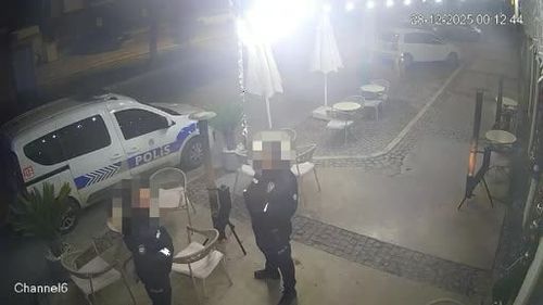 Çeşme Alaçatı'da gece 00.15'te hız iddia edilen bir otomobil, park halindeki polis aracına çarptı; ekip aracı kafeteryanın dış bölümüne girdi, iki polis kıl payı kurtuldu.