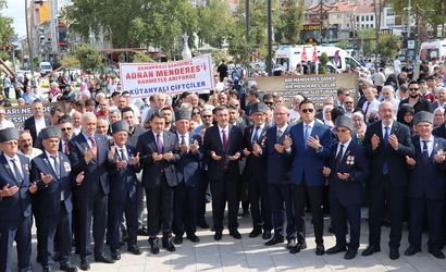 Cumhurbaşkanı Yardımcısı Cevdet Yılmaz (sol 4), Başbakan Adnan Menderes'in idam edilişinin 63. yılı dolayısıyla Kütahya'da düzenlenen anma etkinliğine katıldı. AK Parti Kütahya İl Başkanlığınca parti binası önünden başlatılan Adnan Menderes'i anma kortej yürüyüşü, Menderes Bulvarı takip edilerek Zafer Meydanı'nda sona erdi. Programa Vali Musa Işın (sol 2) da katıldı.