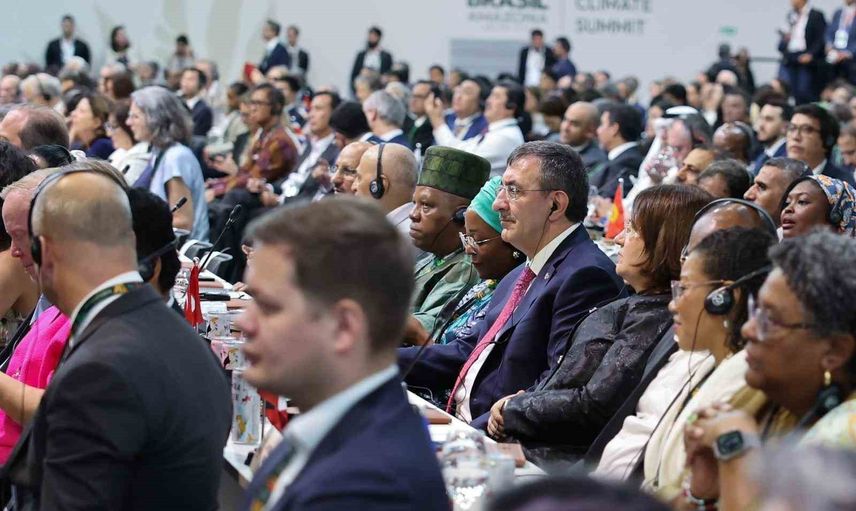 CUMHURBAŞKANI YARDIMCISI CEVDET YILMAZ, BREZİLYA'NIN BELÉM KENTİNDE DÜZENLENEN BİRLEŞMİŞ MİLLETLER (BM) İKLİM DEĞİŞİKLİĞİ ÇERÇEVE SÖZLEŞMESİ 30. TARAFLAR KONFERANSI (COP30) LİDERLER ZİRVESİ’NDE KATILIMCILARA HİTAP ETTİ.