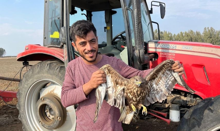 Ceyhan'da çiftçi hasadı bırakarak uçamayan şahine yardım etti