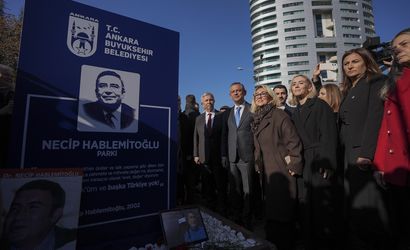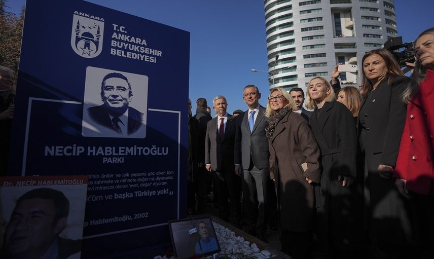 CHP Genel Başkanı Özgür Özel (sağ 2), Çankaya Belediye Başkanı Hüseyin Can Güner (solda) ve Necip Hablemitoğlu'nun eşi Şengül Hablemitoğlu (sağda), Ankara Büyükşehir Belediyesi tarafından Çankaya ilçesinde yapılan Necip Hablemitoğlu Parkı'nın açılışına ve Hablemitoğlu'nu anma törenine katıldı.