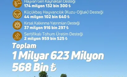 Yapılan ödemeler kapsamında 1 milyar 364 milyon 458 bin 238 lira arıcılık desteği, 174 milyon 132 bin 300 lira hayvan gen kaynakları desteği, 44 milyon 102 bin 300 lira küçükbaş hayvancılık desteği, 37 milyon 916 bin 297 lira kırsal kalkınma yatırımları desteği ve 2 milyon 959 bin 525 lira sertifikalı tohum üretim desteği olmak üzere toplam 1 milyar 623 milyon lira tarımsal destek ödemesi gerçekleştirildi.