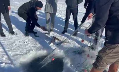Ardahan’da Çıldır Gölü Kristal Buz Festivali hazırlıkları sürüyor. Yüzeyi buz tutan gölde kırılarak atılan balık ağlarının toplanması protokolün katılımıyla gerçekleştirildi.