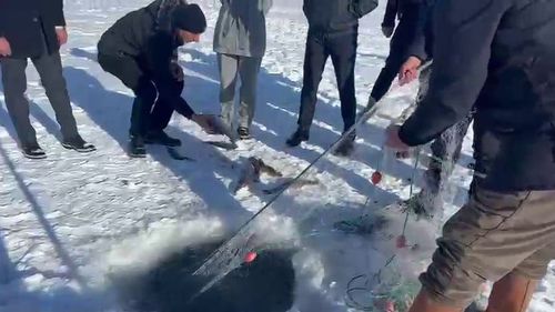 Çıldır Gölü'nde ağ çekme etkinliği: Yetkililer 14 Şubat'taki Kristal Buz Festivali'ne davet etti