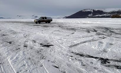 Kars-Ardahan sınırında bulunan buzla kaplı Çıldır Gölü'ne arazi aracıyla çıkan sürücü, yüzeyi donmuş göl üzerinde gezinti yaptı. Dondurucu soğukların etkisiyle Akçakale köyü bölgesinde göl üzerindeki buz kalınlığı 40 santimetreye yaklaştı. Bölgeye gelen bir ziyaretçi olarak gelen Gencay Koçak, arazi aracıyla donan göl üzerinde gezinti yaptı.