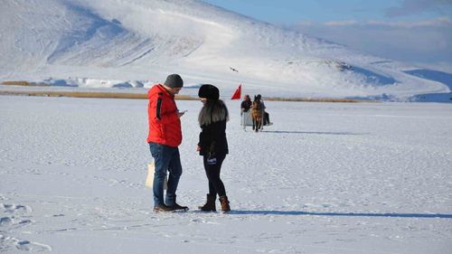 Çıldır Gölü'nde buz kalınlığının artmasıyla atlı kızak sezonu açıldı; ziyaretçiler davul zurna eşliğinde halay çekti, yerli ve yabancı turistler ağırlanıyor.