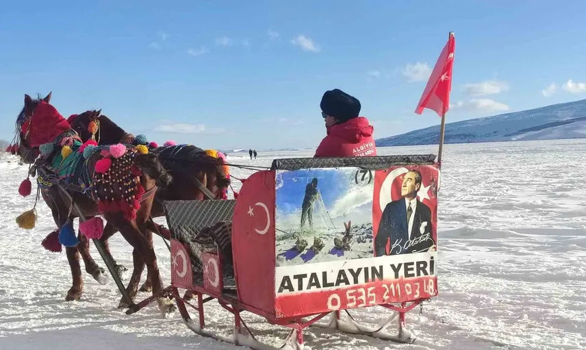 Çıldır Gölü'nde yüzey tamamen dondu, atlı kızak seferleri başladı
