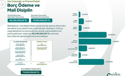 ÇİVRİL BELEDİYE BAŞKANI SEMİH DERE, BELEDİYEYİ 116 MİLYON TL BORÇLA DEVRALDIKLARINI, BUNUN 98 MİLYON TL’SİNİN ÖDENDİĞİNİ VE KALAN BORCUN 17,5 MİLYON TL’YE DÜŞÜRÜLDÜĞÜNÜ AÇIKLADI. AYRICA KULLANILAN 48 MİLYON TL’LİK KREDİNİN PERSONEL HAKLARI VE HİZMET ARAÇLARI İÇİN HARCANDIĞINI BELİRTTİ.